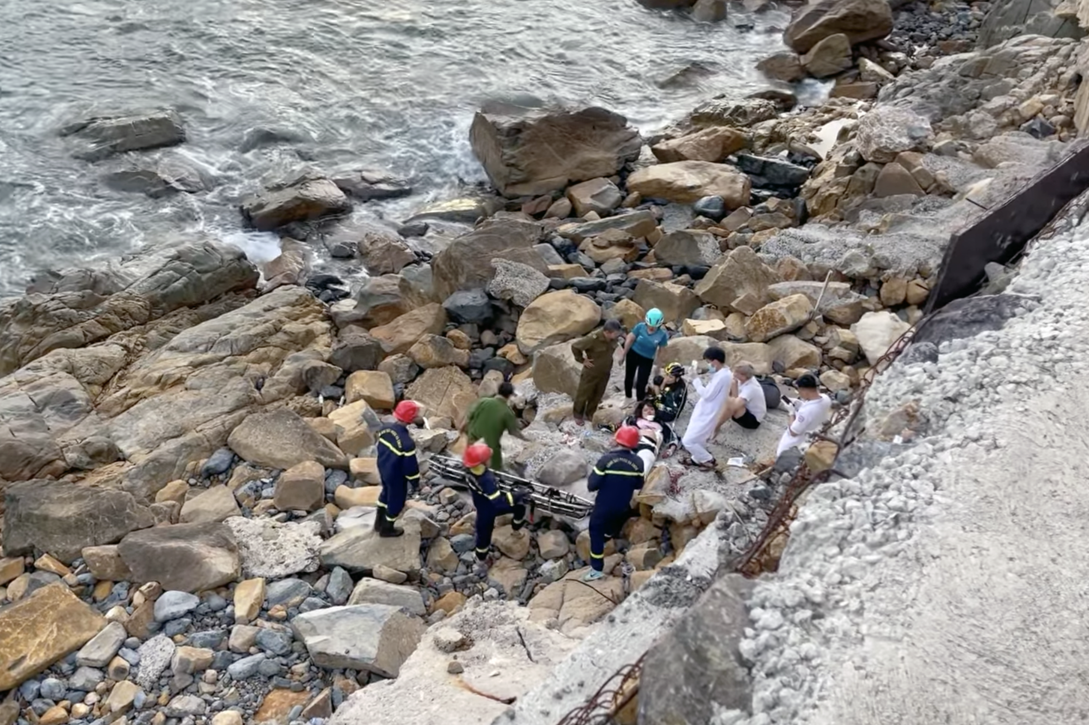 Các chiến sĩ thuộc Phòng cảnh sát phòng cháy chữa cháy và cứu nạn, cứu hộ Công an tỉnh Khánh Hòa đến hiện trường, tìm cách đưa nạn nhân lên khỏi vực.