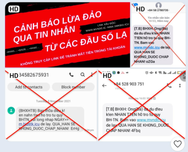 Đến nay, BHXH Việt Nam tiếp tục nhận được nhiều phản ánh về việc có các đầu số khác nhắn tin, gọi điện và gửi đường link đăng nhập và một số ứng dụng, trang web xấu nhằm chiếm đoạt tiền trong tài khoản và thông tin cá nhân của người dân.