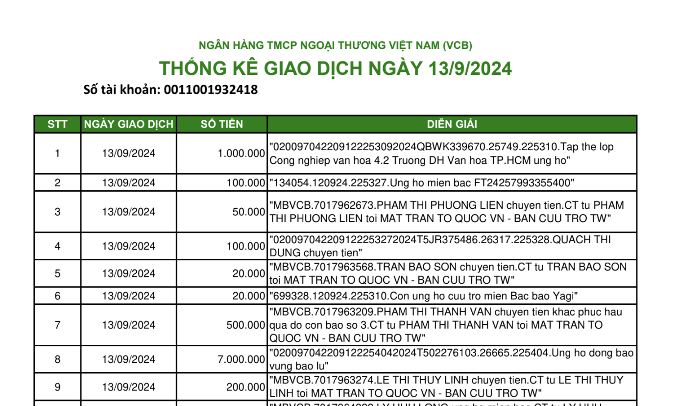 Chiều 16/9, Ủy ban Trung ương Mặt trận Tổ quốc Việt Nam tiếp tục đăng tải 13.358 trang sao kê tiền ủng hộ đồng bào bị ảnh hưởng bởi bão số 3 trong ngày 13/9 qua số tài khoản Ngân hàng Vietcombank 0011001932418.