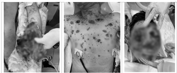 Bệnh nhân được chuyển từ bệnh viện tuyến dưới lên trong tình trạng hôn mê, thở máy, toàn bộ vùng đầu, mặt, cổ và một nửa ngực trên đầy vết thương do các mảnh vỡ của laptop găm vào.