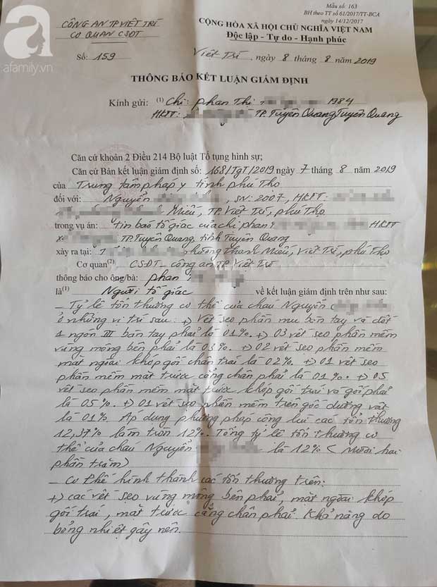 Chiều 13/8, sau khi làm việc với cơ quan Công an TP. Việt Trì, Phú Thọ, trao đổi với PV, chị Phan Thị H. (SN 1984, trú tại TP Tuyên Quang, tỉnh Tuyên Quang) bức xúc cho biết chị đã nhận được thông báo kết luận giám định thương tật của cháu Kh. từ Cơ quan CSĐT – Công an TP Việt Trì. Tuy nhiên chị chưa thấy thỏa đáng với kết quả giám định từ phía cơ quan công an.