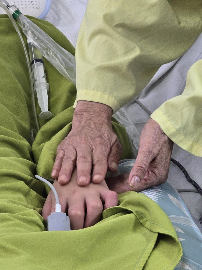 Cùng chăm sóc với chị L. là người bà của Đ. năm nay đã ngoài 60, những ngày qua là nỗi ám ảnh lớn nhất trong cuộc đời bà. Ngồi cạnh giường điều trị, người bà liên tục xoa tay, chân cho Đ., thi thoảng bà lại ghé sát tai cháu thủ thỉ với hi vọng cháu sẽ tỉnh dậy đáp lại. "Đ. ơi, dậy đi con, bà và mẹ ở đây mà….". Những câu gọi kèm tiếng khóc nấc cứ thế vang vọng khắp căn phòng khiến ai chứng kiến cũng không cầm được lòng. Khi được hỏi về Đ., người bà chẳng thể nói được gì, nhìn cháu bà khóc xé lòng: "Đau lắm,… cháu tôi…".