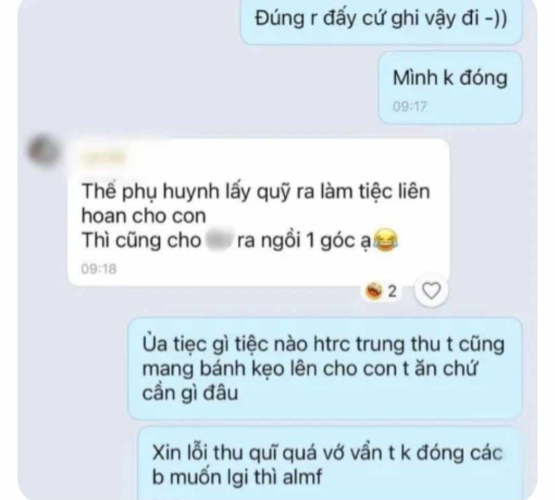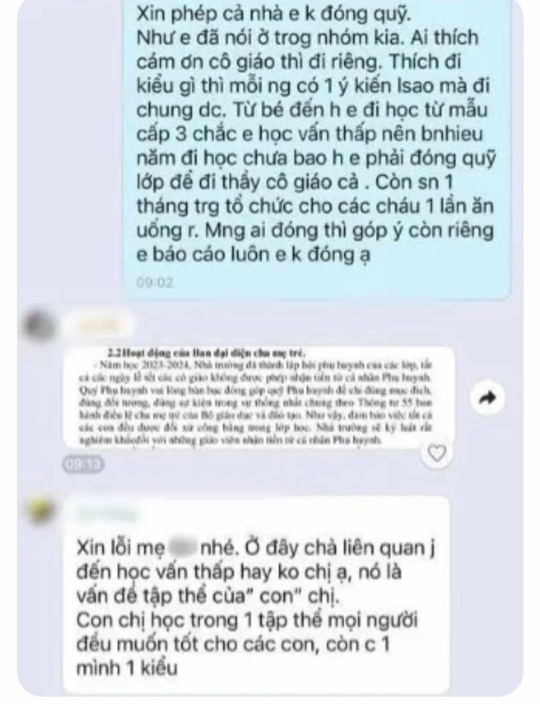 Phụ huynh này chia sẻ thêm: "Em không đồng ý đóng quỹ. Trong nhóm mọi người nói nếu em không đồng ý đóng quỹ, con em có thể chuyển trường. Nếu em không đóng quỹ lớp, con em có thể chuyển lớp. Nếu con không thể chuyển lớp đồng nghĩa là con sẽ bị ra rìa... Một năm, em đã phải đóng 2,7 triệu đồng tiền đầu kỳ, nên các khoản thu bất hợp lý khác ngoài nhà trường thu, em xin phép không đóng".