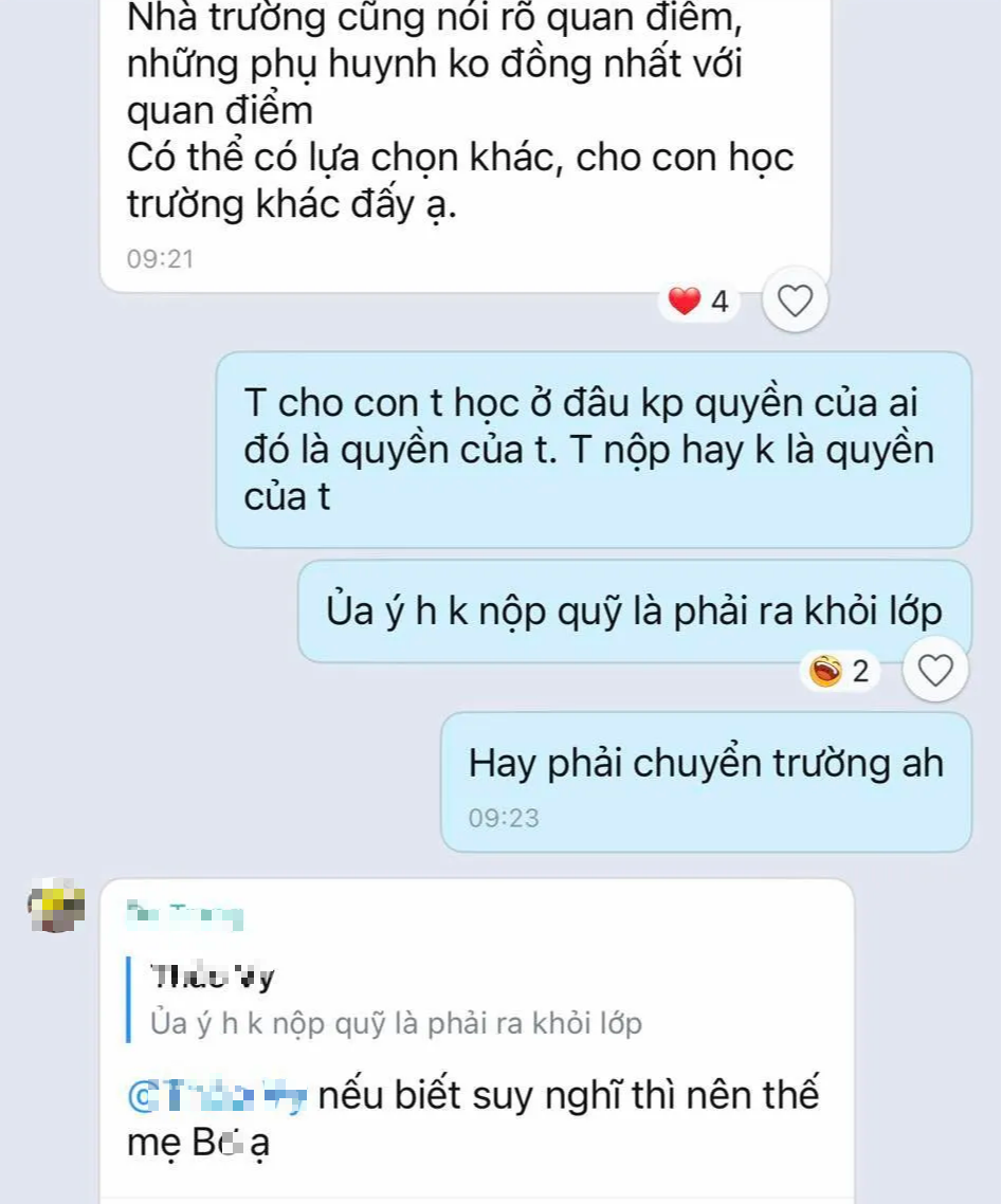 Mọi việc trở nên căng thẳng khi một người khác gợi ý bà mẹ này nên chọn phương án khác, đổi trường cho con nếu không đồng tình với quan điểm chung. Khi bà mẹ này phản đối, cho rằng con học ở đâu là quyền của mình, không có chuyện từ chối nộp quỹ là con phải ra khỏi lớp hay chuyển trường, phụ huynh bên trên lại tiếp tục nhắn với nội dung không mấy tích cực: "Nếu biết suy nghĩ thì nên như thế".