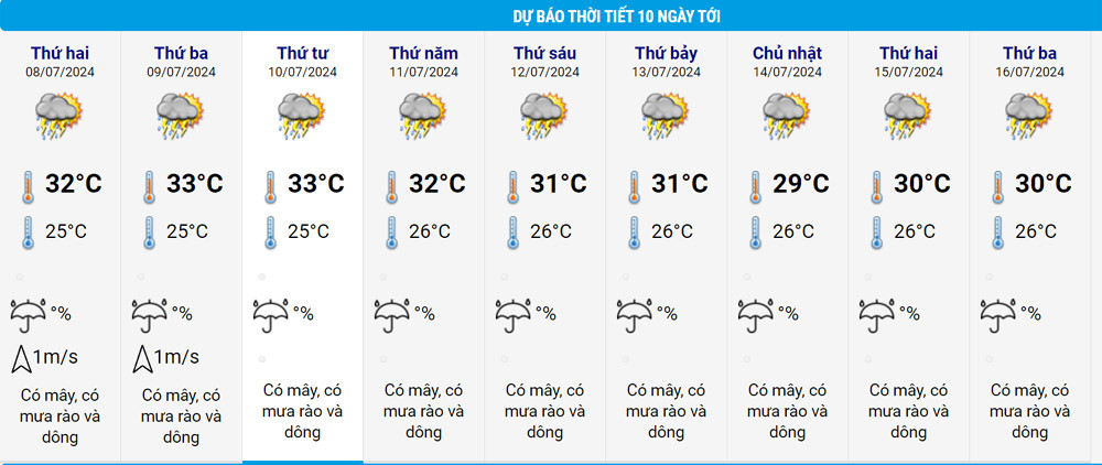 Do ảnh hưởng từ những hình thế trên, thời tiết khu vực TPHCM trong thời kỳ này mưa rào và giông diện rộng liên tiếp, với xác suất mưa 65-75%; riêng từ 13-16/7, xác suất mưa tăng lên 80%.