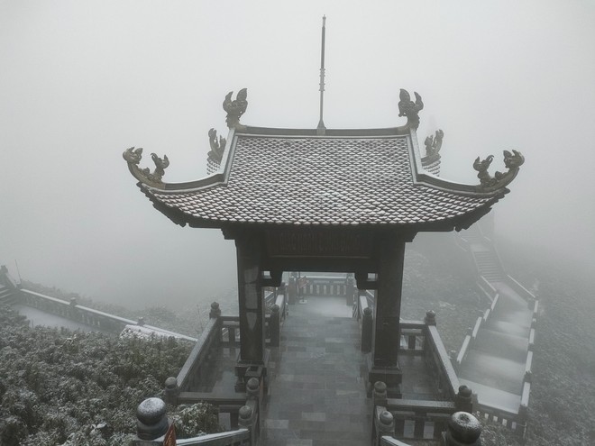 Đặc biệt tuyết rơi dày phủ trắng quần thể tâm linh Fansipan mang dáng dấp chùa Việt cổ, khiến nơi đây càng khoác lên vẻ đẹp huyền hoặc như trong những thước phim cổ trang.