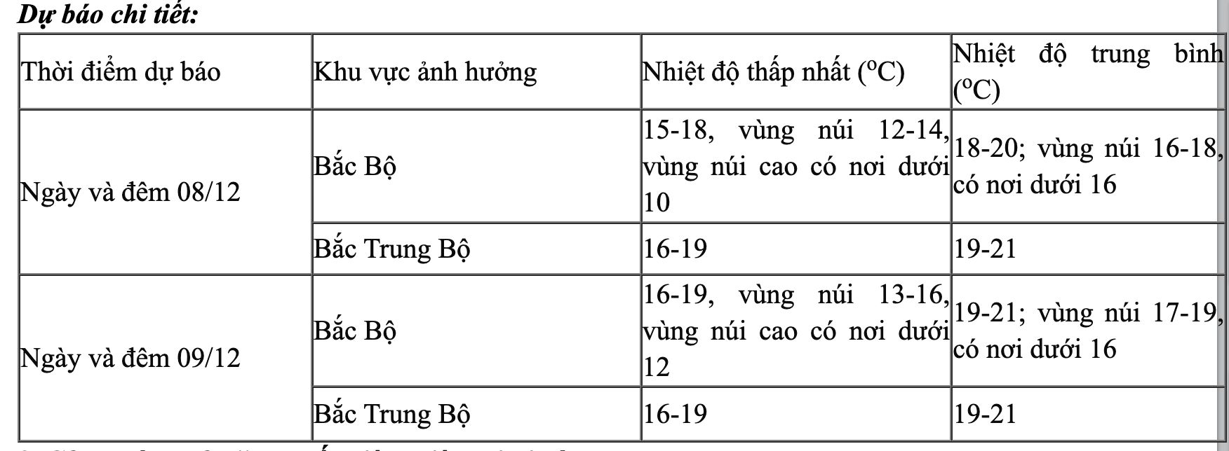 Theo Trung tâm dự báo khí tượng thuỷ văn quốc gia, tron ngày 8/12, không khí lạnh tiếp tục ảnh hưởng đến các nơi khác ở Trung Trung Bộ, sau đó ảnh hưởng đến một số nơi ở Nam Trung Bộ. Gió Đông Bắc trong đất liền mạnh cấp 3, vùng ven biển cấp 4-5.