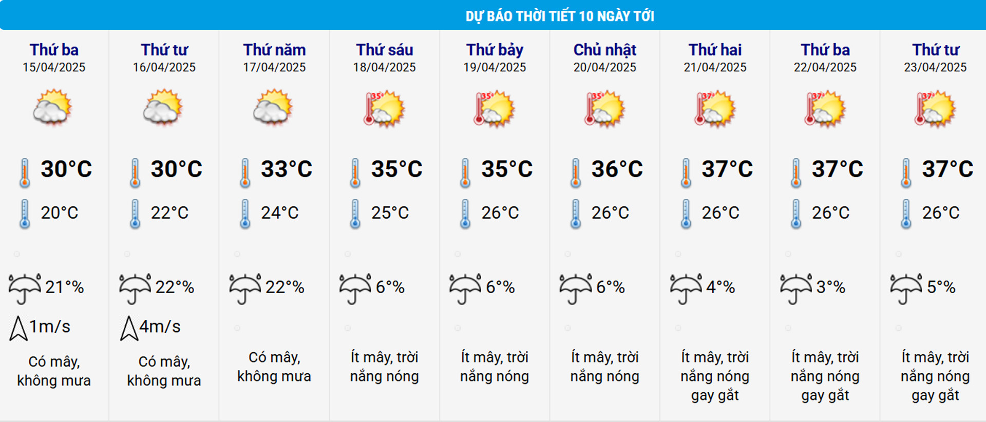 Theo bảng trên có thể thấy, thời tiết Hà Nội từ 18/4 bắt đầu đạt mức nắng nóng với 35 độ. Những ngày sau đó, mức nhiệt tiếp tục tăng mạnh, trong 3 ngày đầu tuần tới (21-23/4) đều đạt nắng nóng gay gắt với cao nhất 37 độ.