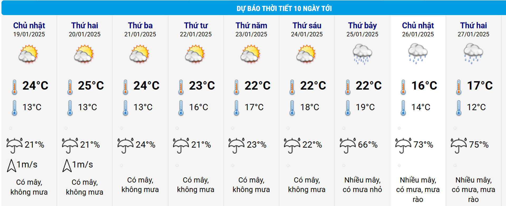 Riêng khu vực Hà Nội, từ 18-20/1 đêm không mưa, sáng sớm có sương mù nhẹ, ngày trời nắng; trời rét. Từ 21-24/1 có mưa vài nơi, sáng sớm có sương mù nhẹ, trưa chiều trời nắng; trời rét.
