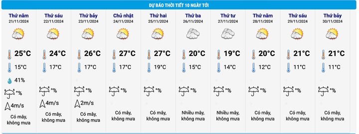 Theo bảng dự báo nhiệt độ và thời tiết 10 ngày tới Hà Nội, khoảng 26/11, nhiệt độ cao nhất ở Thủ đô khoảng 24 độ C, giảm 5 độ C so với ngày hôm trước, thấp nhất 20 độ C. Trong 2 ngày sau đó, nhiệt độ cao nhất trong ngày duy trì 23-24 độ C.
