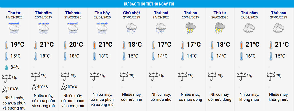 Theo bảng nhiệt độ trên, thời tiết Hà Nội những ngày tới tiếp tục có mưa phùn và sương mù. Từ 19-22/2, nhiệt độ thấp nhất từ 15-18 độ, cao nhất từ 19-21 độ. Từ 23/2, nhiệt độ Hà Nội giảm nhiệt dần với mức cao nhất chỉ còn 17-18 độ, ban đêm giảm còn 14-16 độ.