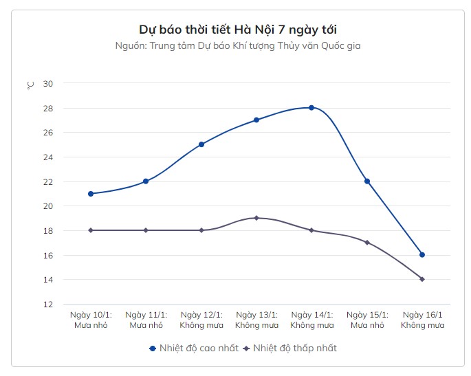 Theo ông Hưởng, thời tiết khu vực Đông Bắc Bộ xuất hiện mưa nhỏ trong ngày 10-11/1, trong khi Tây Bắc Bộ duy trì trạng thái nắng ráo. Đến ngày 12-14/1, nhiệt độ toàn miền Bắc tăng cao và có thể đạt mức cao nhất 25-27 độ C.