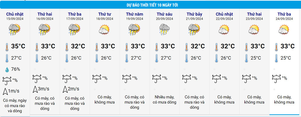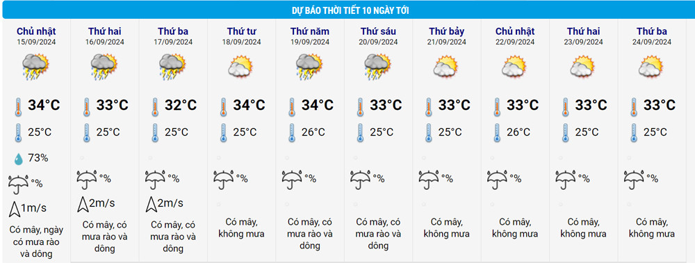 Thời tiết Hà Nội thời kỳ này cũng được dự báo hình thế cơ bản như khu vực miền Bắc với ngày nắng, chiều tối và đêm có mưa rào và giông vài nơi; riêng từ đêm 15-16/9 chiều tối và đêm có mưa rào và giông rải rác.