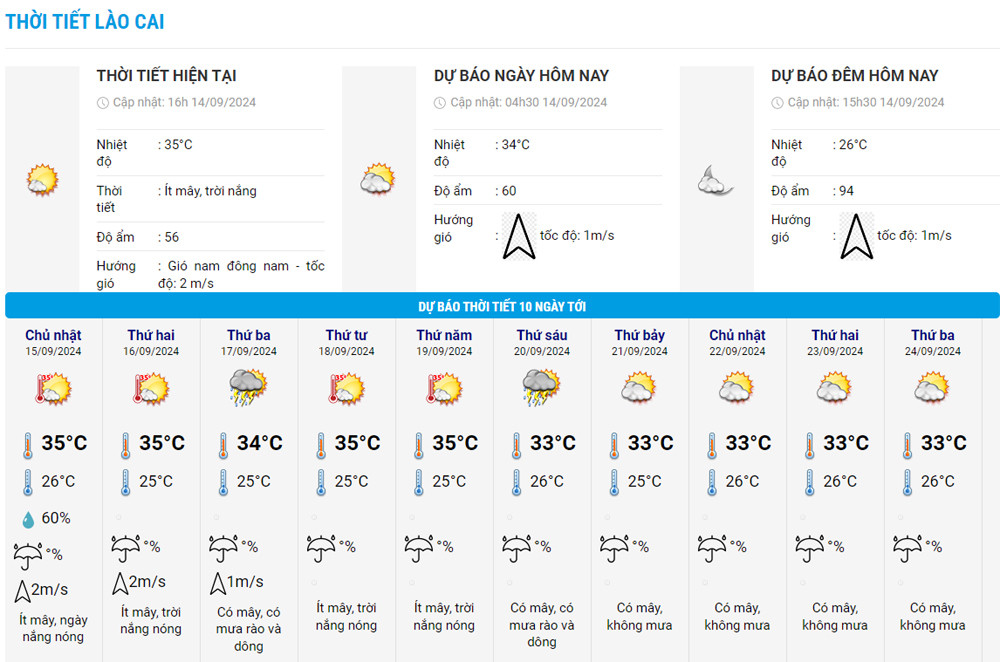 Cũng thời kỳ này, khu vực Trung Bộ ngày nắng, chiều tối và đêm có mưa rào và giông vài nơi; riêng từ 16-17/9, chiều tối và đêm có mưa rào và giông rải rác. Trong đó, Trung và Nam Trung Bộ, từ 14-19/9 có mưa rào và rải rác có giông, cục bộ có mưa to; ngày 20/9 có mưa rào và giông rải rác.
