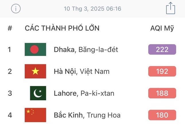 Ứng dụng quan trắc không khí toàn cầu AirVisual lúc 6h00 sáng nay xếp Hà Nội ô nhiễm thứ hai thế giới, chỉ sau thành phố Dhaka của Bangladesh, vượt qua điểm nóng Lahore của Pakistan.
