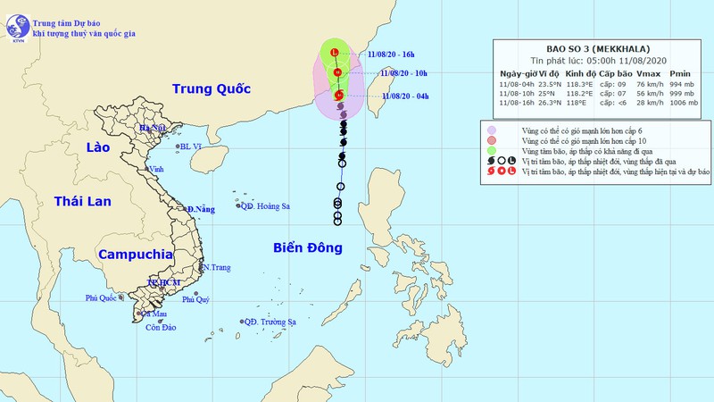 Theo Trung tâm Dự báo Khí tượng Thủy văn Quốc gia, sáng 11/8, bão số 3 ở khoảng 23,5 độ Vĩ Bắc; 118,3 độ Kinh Đông, ngay trên vùng biển phía Nam tỉnh Phúc Kiến (Trung Quốc). Sức gió mạnh nhất vùng gần tâm bão mạnh cấp 9 (75-90km/giờ), giật cấp 11. Bán kính gió mạnh từ cấp 6, giật từ cấp 8 trở lên khoảng 130km tính từ tâm bão.