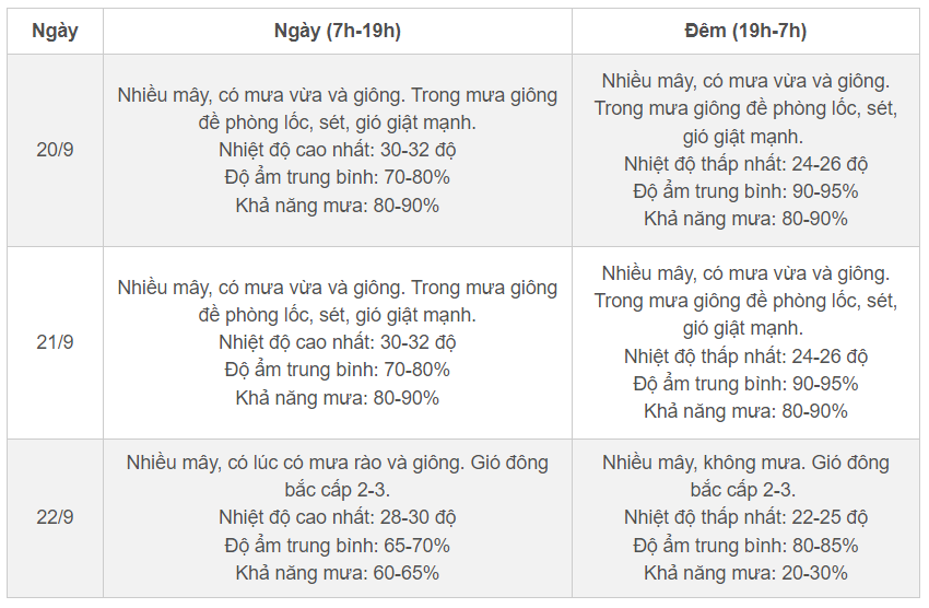 Tại Bắc và Trung Trung Bộ, đêm 19/9 và ngày 20/9: khu vực từ Thanh Hóa đến Quảng Trị có mưa vừa, mưa to, cục bộ có nơi mưa rất to và rải rác có dông, riêng khu vực từ Hà Tĩnh đến Quảng Trị có mưa to đến rất to. Các khu vực khác có mưa rào và dông rải rác, cục bộ có mưa to.