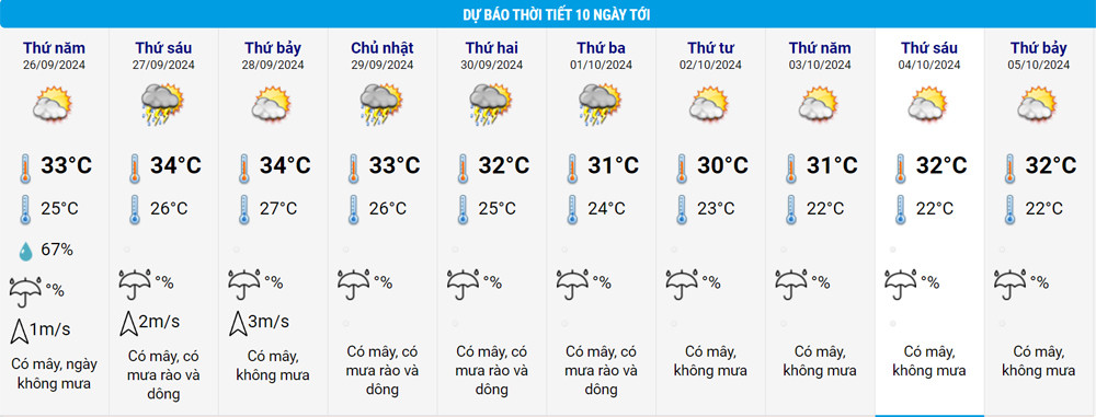 Từ đêm 27 đến ngày 5/10, ở Bắc Bộ tiếp tục có mưa rào và giông vài nơi; riêng thời kỳ từ 28/9-1/10 khả năng có mưa rào và giông rải rác.