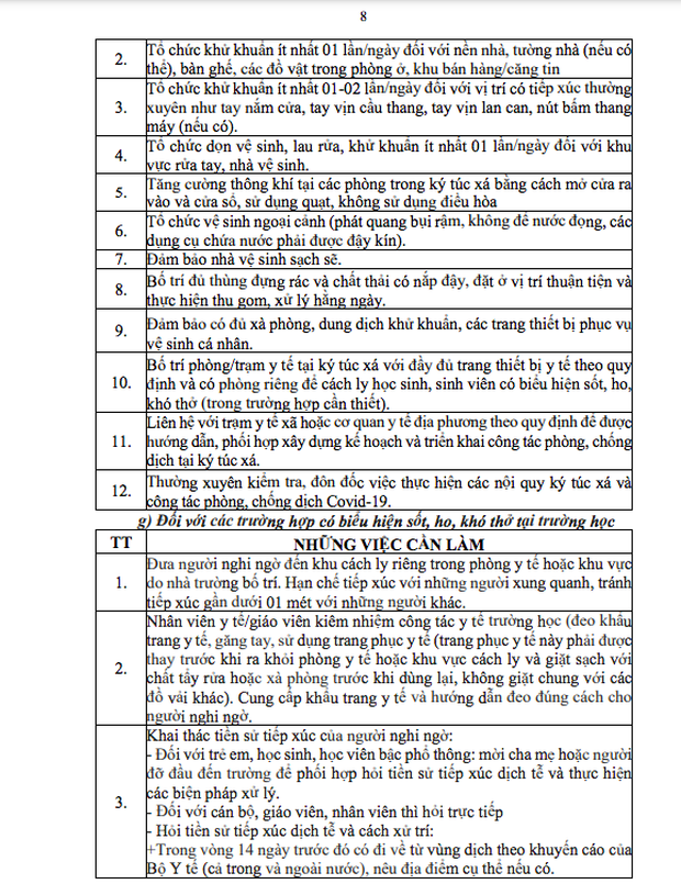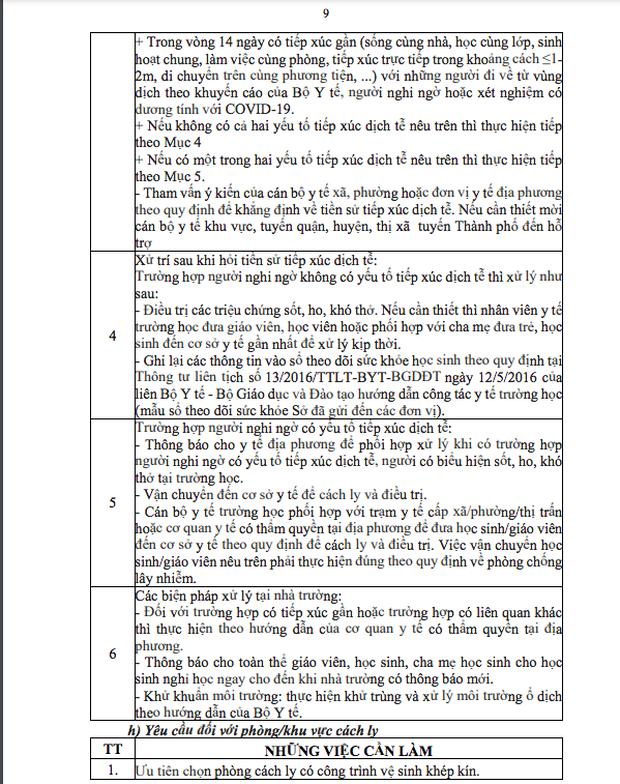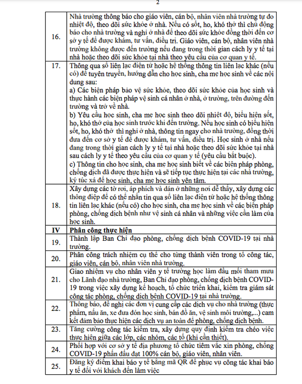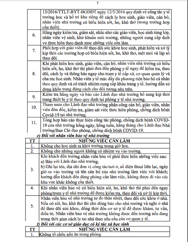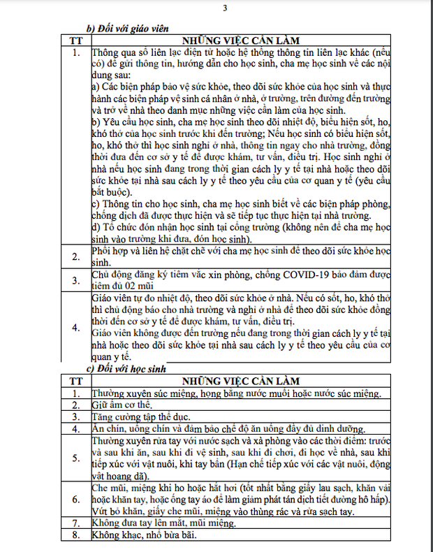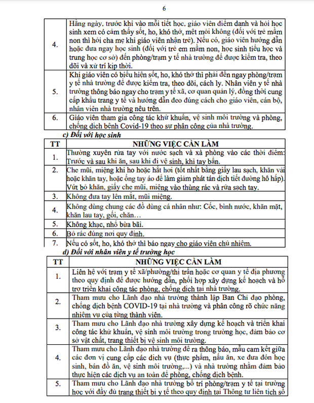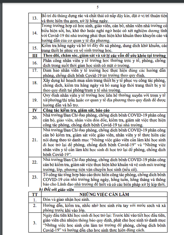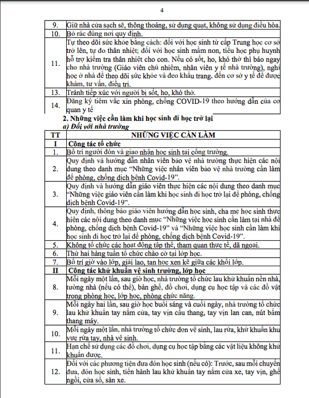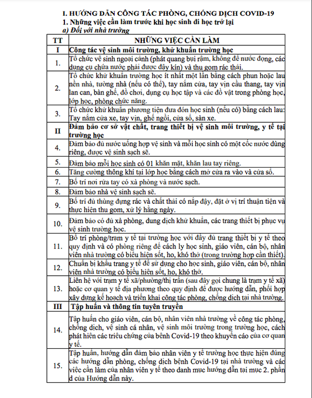 Văn bản hướng dẫn nêu rõ, những việc cần làm của từng bộ phận, thành viên trong nhà trường (giáo viên, học sinh, nhân viên y tế...) ở hai giai đoạn: Trước khi học sinh trở lại trường và khi học sinh đi học trở lại.