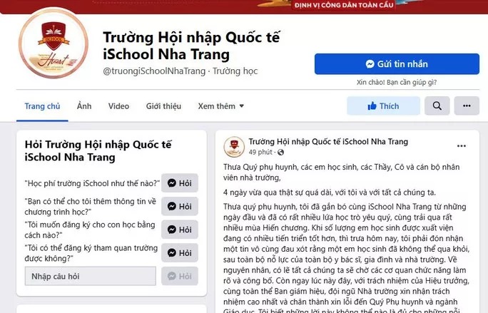 Trên fanpage của nhà trường, ông Phạm Hữu Bình, Hiệu trưởng Trường iSchool Nha Trang, cũng xác nhận thông tin nói trên.