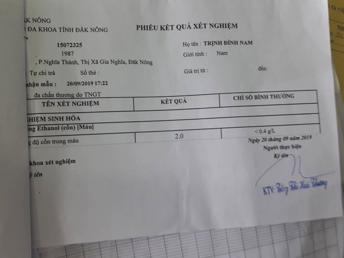 Theo kết quả kiểm tra của Bệnh viện Đa khoa tỉnh Đắk Nông, nồng độ cồn trong máu của ông Nam là 2.0 g/l, cao hơn chỉ số bình thường cho phép đến 5 lần.