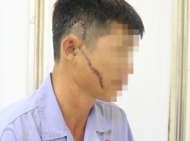 Tại phòng phẫu thuật, các bác sĩ xác định vết thương dài khoảng 20 cm từ vùng thái dương phải kéo dài qua trước tai phải đến má phải. Vết thương có bờ nham nhở, rách, đứt cơ thái dương nông lộ xương, đứt động mạch thái dương nông, đứt vào thùy nông tuyến mang tai phải, rách bán phần sụn ống tai phải.