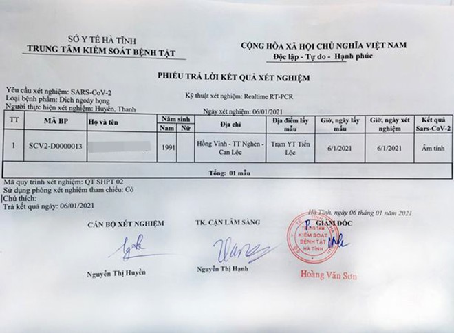 Theo kết quả xét nghiệm từ CDC Hà Tĩnh, N.T.T. đã âm tính lần 1 với SARS-CoV-2.
