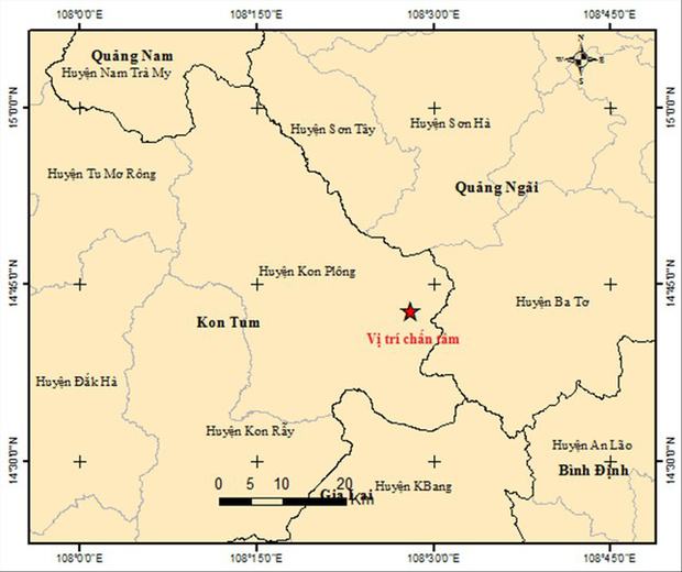 Trận động đất mạnh nhất xảy ra lúc 12 giờ 54 phút 22 giây trưa qua (18/4) ở tọa độ (14.713 độ vĩ Bắc, 108.468 độ kinh Đông), độ sâu chấn tiêu khoảng 8.1 km, thuộc huyện Kon Plông, tỉnh Kon Tum. Ngay sau đó, lúc 14h19 phút, một trận động đất có độ lớn 3.6 cũng xảy ra ở khu vực này. Tính từ ngày 15/4 đến chiều qua, khu vực này đã ghi nhận tổng cộng 20 trận động đất, trong đó riêng ngày 15/4 có tới 7 trận động đất.