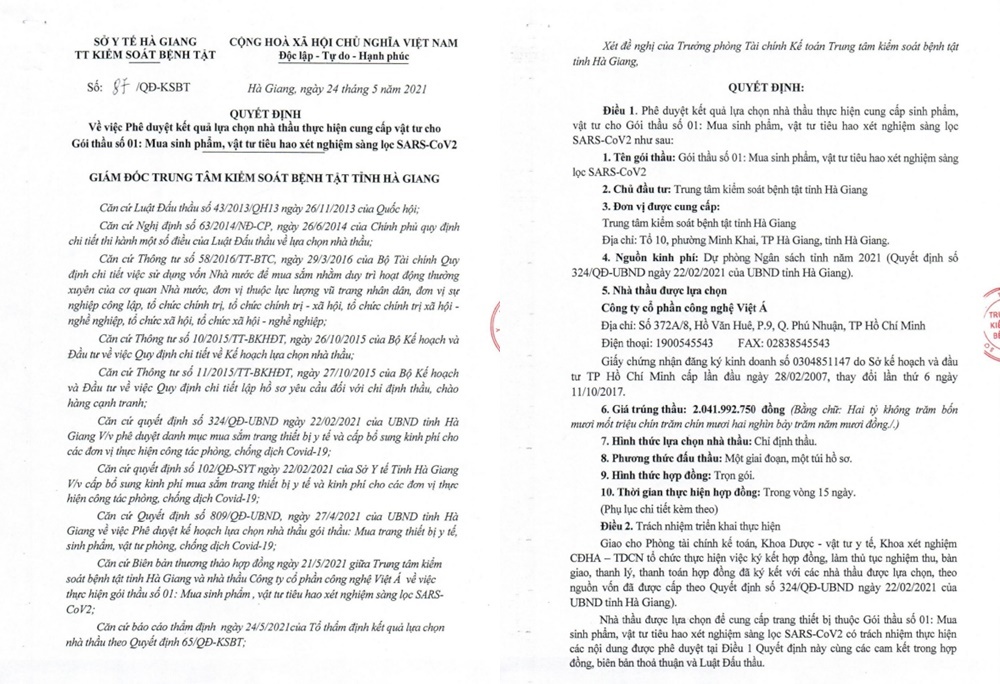 Cụ thể, ngày 24/5/2021, ông Nguyễn Trần Tuấn - Giám đốc CDC Hà Giang ký quyết định phê duyệt kết quả lựa chọn Công ty cổ phần Công nghệ Việt Á (Công ty Việt Á) trúng thầu gói thầu số 01 Mua sinh phẩm, vật tư tiêu hao xét nghiệm sàng lọc SARS-CoV-2. Giá trúng thầu là 2.041.992.750 đồng.