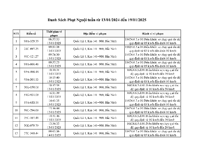 Cách đây ít ngày, cảnh sát giao thông tỉnh Bắc Ninh đã công bố danh sách gần 600 phương tiện vi phạm tốc độ trong giai đoạn từ ngày 13/1 đến ngày 19/1. Các phương tiện vi phạm diễn ra trên nhiều tuyến đường thuộc địa bàn tỉnh Bắc Ninh, chủ yếu thuộc lỗi chạy quá tốc độ; trong đó một số xe bị bắt lỗi đỗ xe ngược chiều, hoặc không đội mũ bảo hiểm.