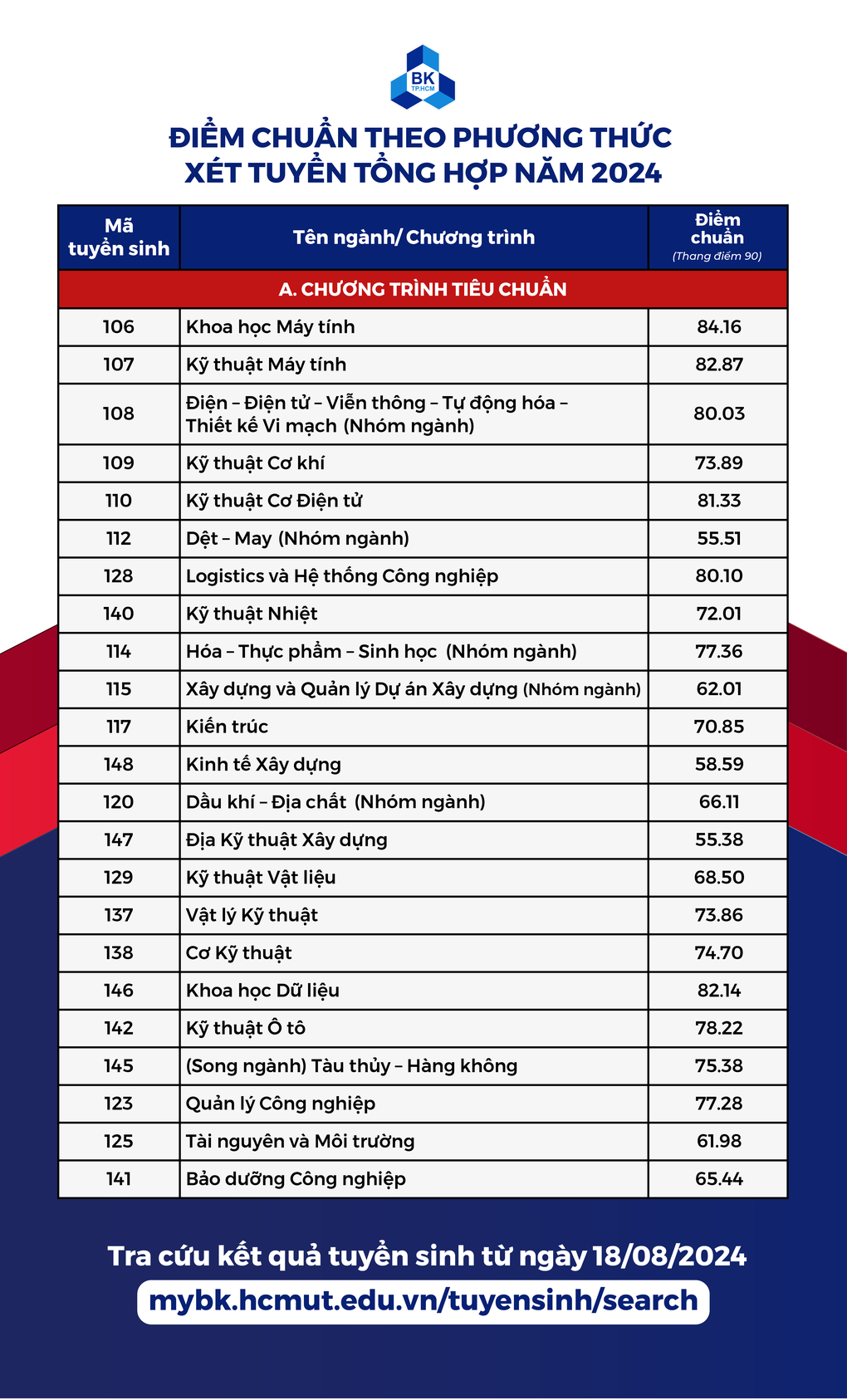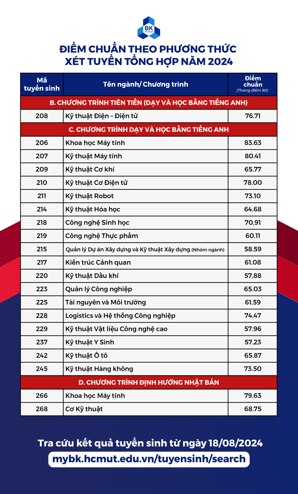 Điểm chuẩn Đại học Bách khoa TP.HCM 2024 như sau: