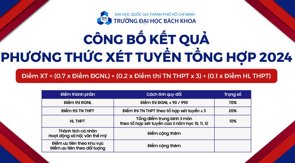 Mọi người thường đã quen thuộc với điểm chuẩn theo phương thức xét điểm thi tốt nghiệp THPT (thang điểm 30 và thang điểm 40), tuy nhiên, điểm chuẩn của trường Đại học Bách khoa TP.HCM không theo hình thức này. Trong đề án tuyển sinh của Đại học Bách khoa TP.HCM, trường không dành riêng chỉ tiêu cho phương thức thi tốt nghiệp THPT 2024. Thay vào đó, trường sẽ có cách tính điểm riêng được gọi là Phương thức Xét tuyển kết hợp nhiều tiêu chí. Phương thức này chiếm 75% - 90% tổng chỉ tiêu trong năm nay.