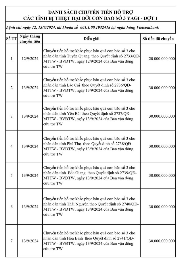 Ban Vận động Cứu trợ Trung ương sẽ tiếp tục cập nhật và công khai danh sách các tổ chức, cá nhân ủng hộ và việc phân bổ nguồn lực hỗ trợ đến các địa phương chịu thiệt hại bởi cơn bão số 3 trên các phương tiện thông tin đại chúng.