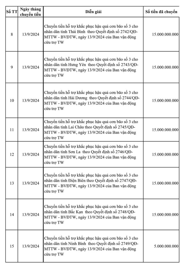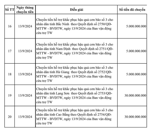 Ngày 15-9, Ban vận động Cứu trợ Trung ương cho biết, với tinh thần hỗ trợ cao nhất nhanh nhất, kịp thời nhất và đến tận tay người dân, trong 2 ngày 12 và 13-9, Ban Vận động Cứu trợ Trung ương, Ủy ban Trung ương MTTQ Việt Nam đã ban hành các Quyết định phân bổ lần 1 chuyển về Ban Vận động Cứu trợ 20 tỉnh bị thiệt hại do bão số 3 gây ra .