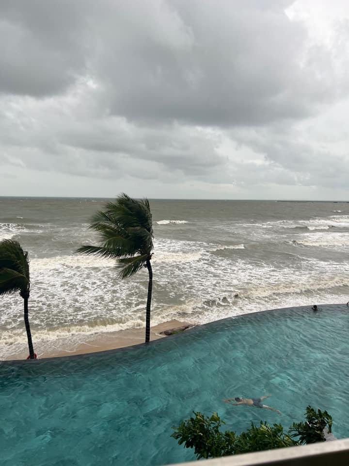 "Mưa bão tại Phú Quốc đang rất lớn, thời tiết quá xấu. Mình và toàn bộ du khách trong đoàn không thể ra ngoài, đành chôn chân trong khách sạn", anh Huỳnh Quang Khải (TPHCM), một hướng dẫn viên đang có mặt tại khu vực trung tâm huyện đảo Phú Quốc chia sẻ với báo VietNamNet.