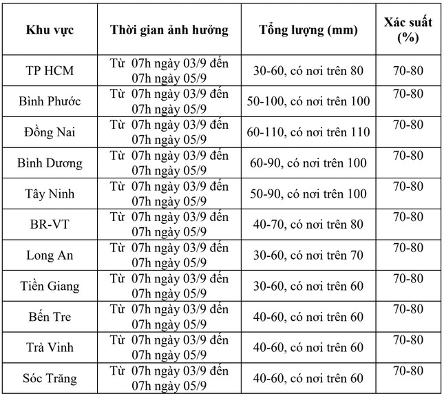 Từ ngày 3/9 đến ngày 5/9, khu vực Nam Bộ có mưa rào nhiều nơi, rải rác mưa vừa và dông, có nơi mưa to đến rất to.