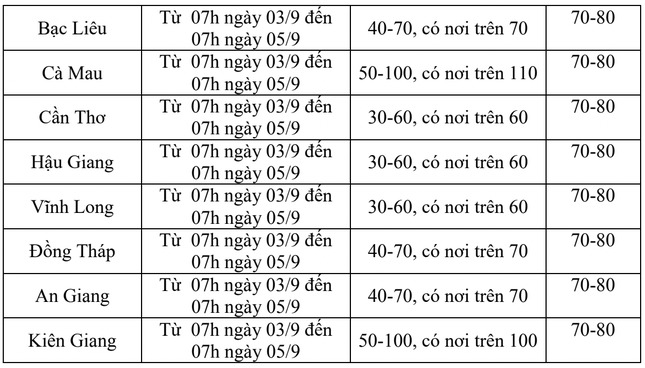 Lượng mưa từ 1h ngày 2/9 đến 1h ngày 3/9 ở một số nơi như sau: U Minh - Cà Mau 68.8mm, Thới Bình - Cà Mau 70.6mm, Ngan Dừa - Bạc Liêu 70.0mm, Thị trấn Rạch Gòi - Hậu Giang 78.6mm, Gò Quao - Kiên Giang 103.8mm, Giồng Riềng - Kiên Giang 109.6mm, Vĩnh Hòa Hưng - Kiên Giang 109.6mm,...