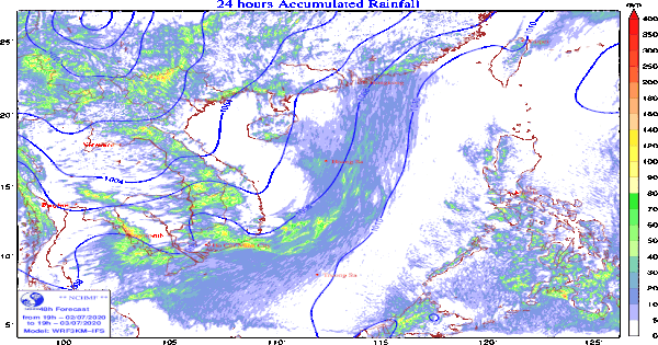 Từ chiều tối và đêm 02-04/7. Phía Bắc có mưa rào và dông rải rác, riêng vùng núi Thanh Hóa, Nghệ An cục bộ có mưa vừa, mưa to. Phía nam chiều tối và đêm có mưa rào và dông vài nơi; ngày nắng, có nơi có nắng nóng. Trong cơn dông có khả năng xảy ra lốc, sét, mưa đá và gió giật mạnh.
