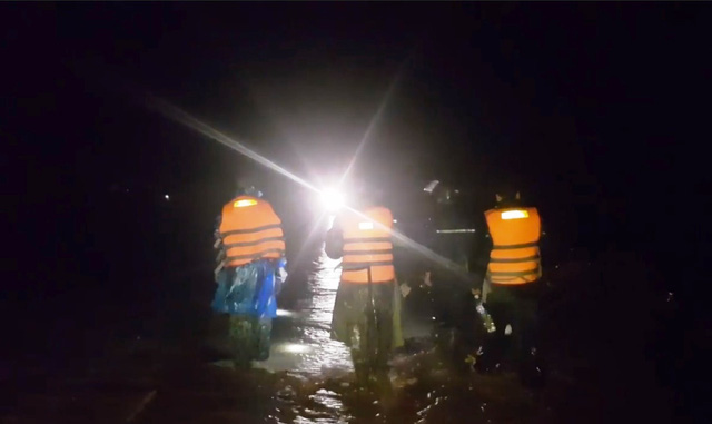 Đến 23h cùng ngày, tuy mưa đã ngớt hơn nhưng nước qua ngầm của con đập tràn này vẫn chảy rất xiết, gây nhiều khó khăn cho việc tìm kiếm trong đêm.