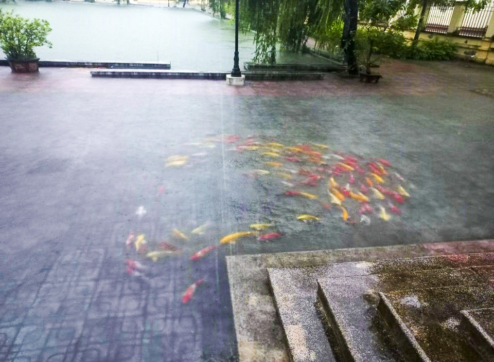 Hình ảnh được chia sẻ khiến nhiều người tò mò, được chiêm ngưỡng đàn cá Koi hàng trăm con đang vùng vẫy trong sân ngập nước mưa.