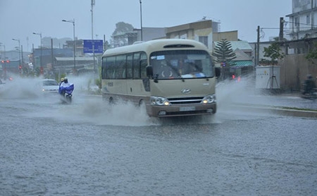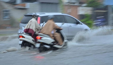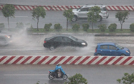 Trong và sau cơn mưa, nước ngập sâu gần nửa mét khiến hàng vạn phương tiện vô cùng khổ sở bì bõm lội trong nước. |