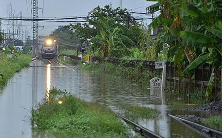 Đoạn đường sắt Bắc - Nam (qua khu vực cầu Bình Lợi, quận Bình Thạnh, TP HCM) cũng ngập nặng khiến nhiều đoàn tàu phải giảm tốc độ để tránh nguy hiểm khi lưu thông qua. |