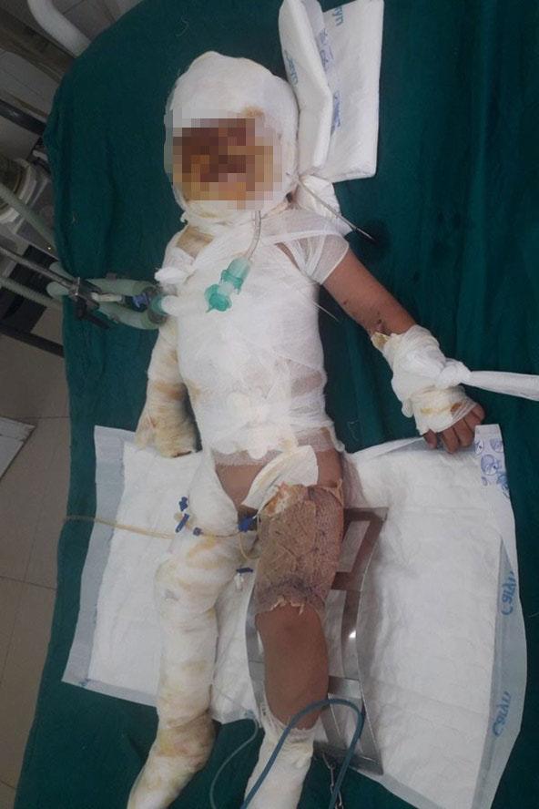 Cháu Gia Bảo được các bác sĩ chẩn đoán bị bỏng nặng nhất là 40% độ III, IV, trong đó 20% là bỏng sâu khắp cơ thể