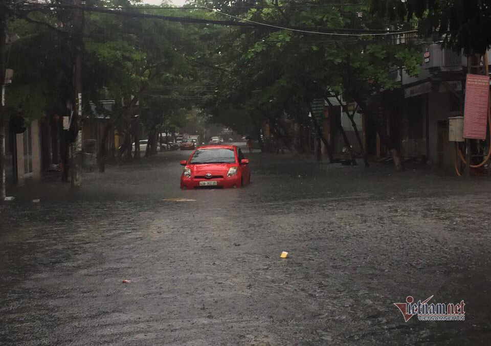 Tại tuyến đường Lý Tự Trọng (quận Hải Châu) nước ngập sâu khiến một số ô tô, xe máy bị chết máy. Nước tràn vào các nhà dân ở một số ngõ hẻm...