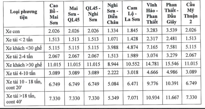 Cụ thể, cao tốc: Cao Bồ - Mai Sơn mức thu 2.026 đồng/km; Mai Sơn - quốc lộ 45 thu 2.026 đồng/km; quốc lộ 45 - Nghi Sơn thu 2.026 đồng/km; Nghi Sơn-Diễn Châu thu 1.334 đồng/km; Cam Lộ - La Sơn thu 1.845 đồng/km; Vĩnh Hảo - Phan Thiết thu 3.283 đồng/km; Phan Thiết - Dầu Giây thu 3.539 đồng/km; cầu Mỹ Thuận 2 thu 2.026 đồng/km.