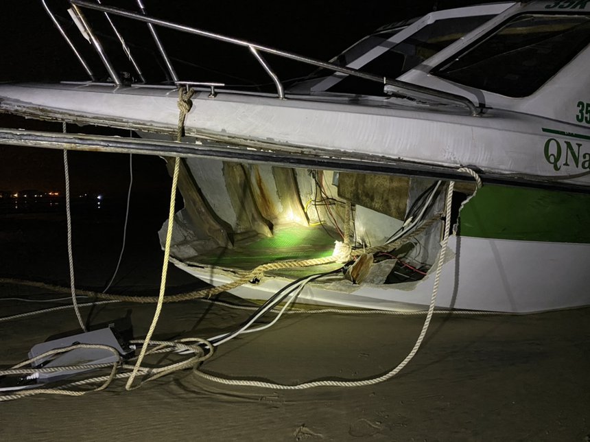 Hình ảnh từ hiện trường cho thấy mũi cano bị vỡ mảng lớn, củng cố thêm nhận định phương tiện này đâm vào cồn cát trước khi bị sóng đánh chìm.