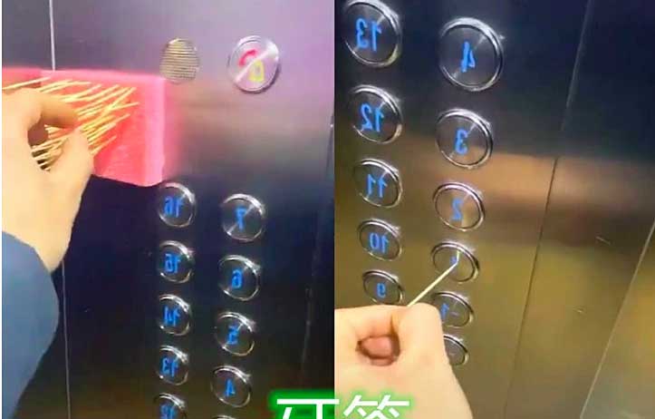 Để ngăn ngừa lây nhiễm chéo, một số thang máy Trung Quốc đã cung cấp tăm cho người dân ấn thang và vứt bỏ sau khi dùng. Tuy nhiên, theo bác sĩ Chen Zhijin, nếu trong thang có người bị nhiễm corona hắt hơi, hoặc anh ta chạm vào vài chiếc tăm trong khi lấy thì sẽ có những giọt bắn nhỏ trên tăm. Khi bạn dùng tăm để ấn thang máy mà không rửa tay thì vẫn bị lây nhiễm virus.