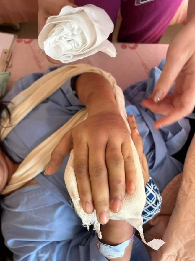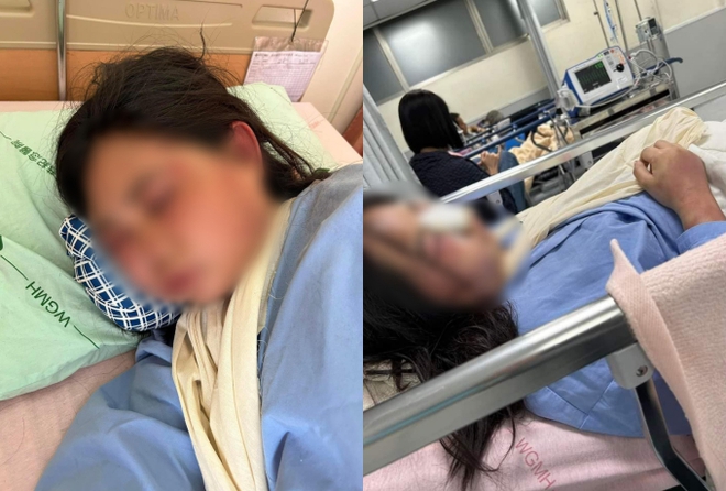 Được biệt, sau khi bị hành hung dẫn đến nhập viện, cô gái đã phải khâu 15 mũi ở tay, chân và kèm theo nhiều vết bầm tím chi chít khắp cơ thể. "Chị gái em bị thương khá nặng mặt mũi bầm tím, khâu 4 mũi trên đầu, 11 mũi dưới chân, gãy xương h`ông, gãy tay, gãy mũi và bầm tím khắp cơ thể", Hoàng T. cho biết.