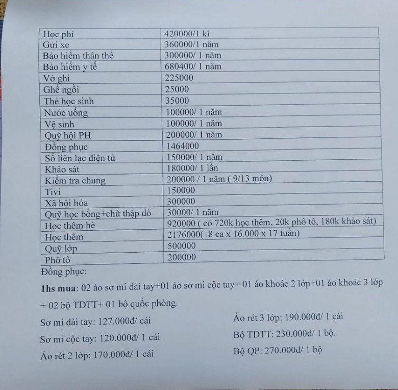 Cụ thể, theo bản danh sách, tiền tivi 150.000 đồng; gửi xe 360.000 đồng/năm; ghế ngồi 25.000 đồng, học thêm 2,176 triệu đồng, photo 200.000 đồng, xã hội hóa 300.000 đồng, sổ liên lạc điện tử 150.000 đồng/năm...