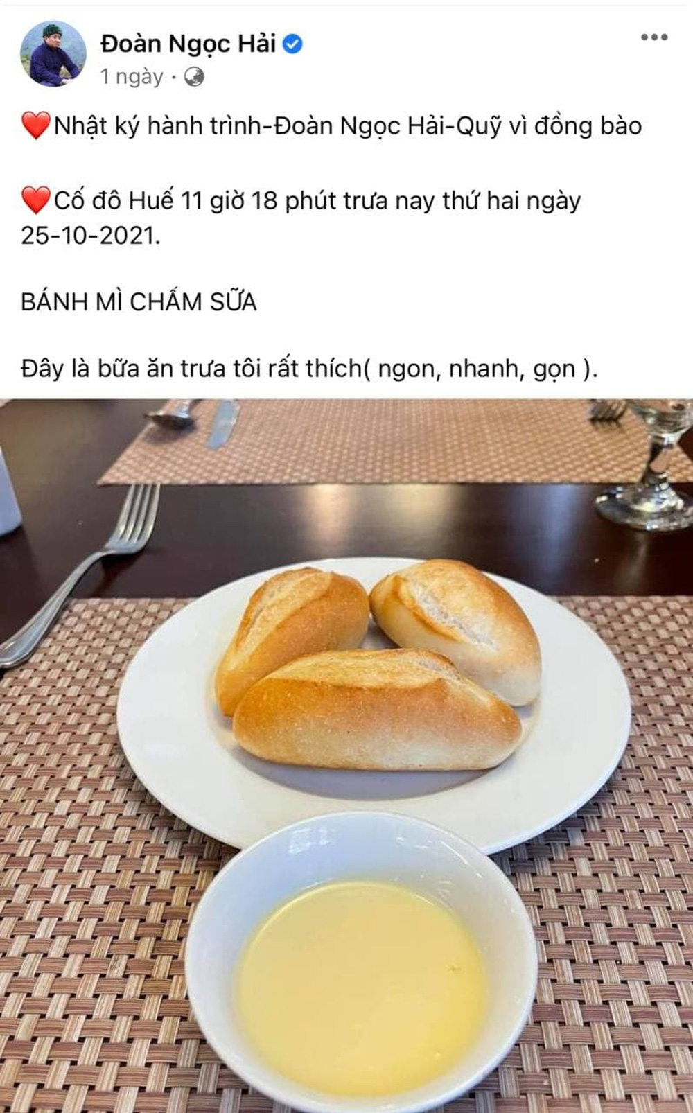 Theo hình ảnh được ông Hải đăng tải, ông đang có mặt tại một địa điểm ăn uống và bên cạnh là bữa ăn với thực đơn hết sức giản dị là bánh mỳ chấm sữa.